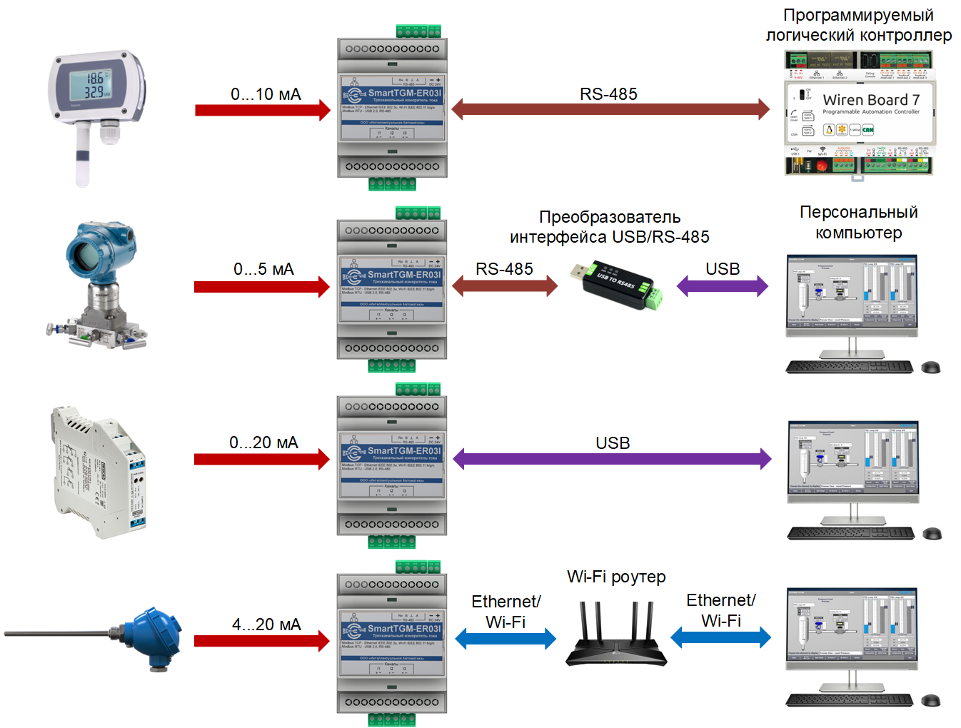 Модуль аналогового ввода «Трехканальный измеритель тока SmarTGM-ER03I» применяется совместно с программируемым логическим контроллером либо с персональным компьютером, интегрированными в автоматизированные системы управления технологическими процессами (АСУ ТП) и платформы интернета вещей, для преобразования аналоговых сигналов (унифицированных токовых сигналов) от датчиков давления, температуры, уровнемеров, расходомеров и т. д. в цифровой код с последующей передачей измеренного значения по интерфейсам USB, RS-485 (протокол Modbus RTU) и Ethernet, Wi-Fi (протокол Modbus TCP).